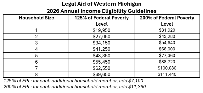 Sometimes we receive special grant funding that allows us to offer legal help to clients with incomes above 200% of the federal poverty level but who still are unable to hire legal counsel. Currently we are able to help senior citizens (person over age 60) and persons with federal tax issues even if their income exceeds our normal eligibility criteria.